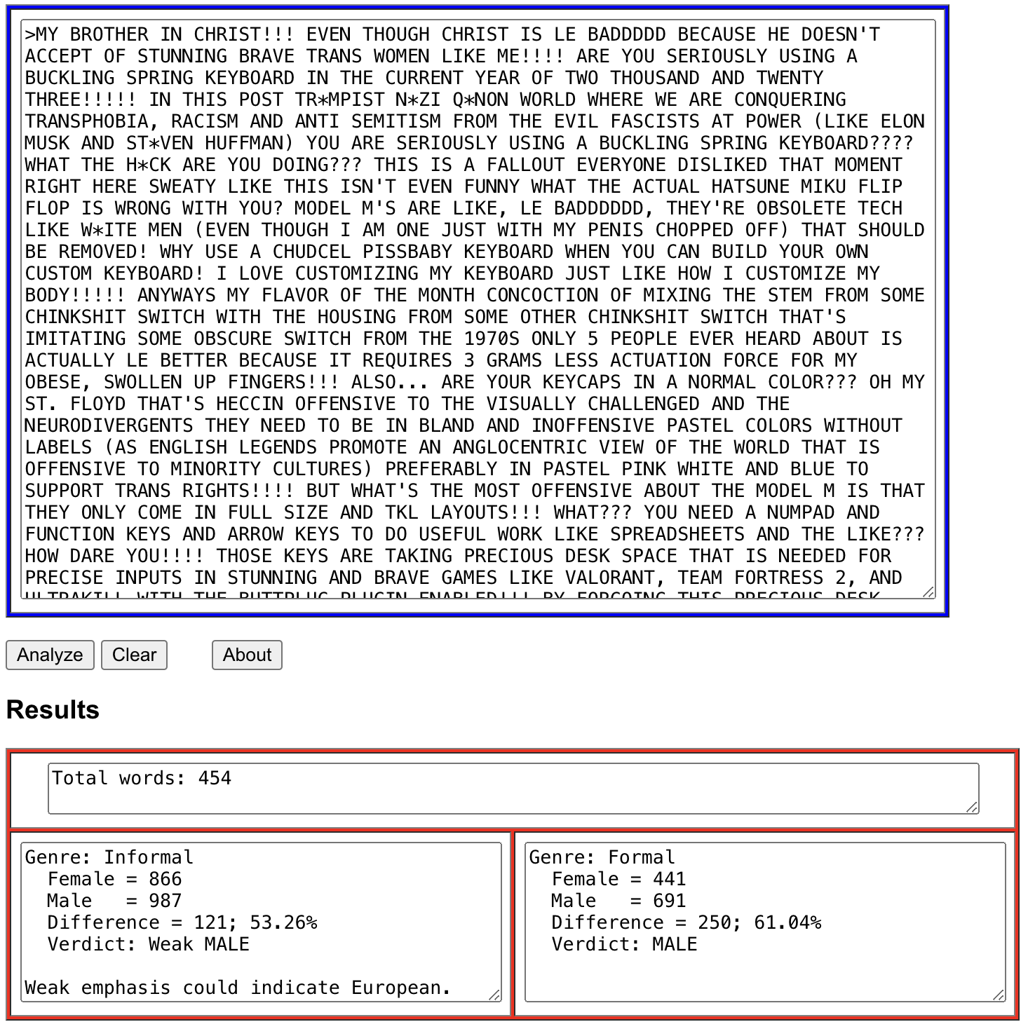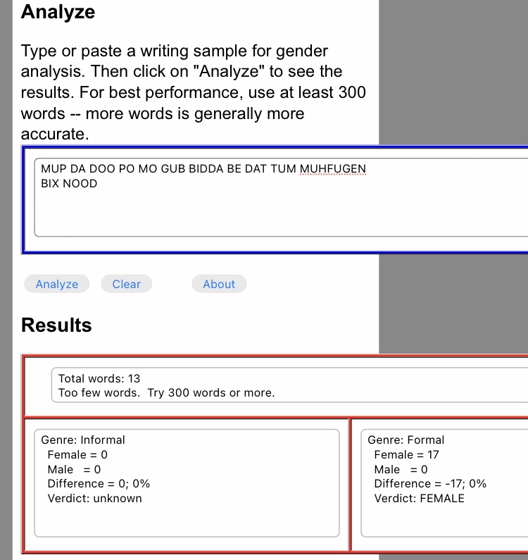 "This Gender Guesser system is heavily based on the Gender Genie. In particular, the word lists and weights are reproduced from the Gender Genie. The Gender Guesser extends the interpretation of informal writing to work on blogs and chat-room messages, and combines formal writing styles (fiction, non-fiction, essays, news reports, etc.). It also looks for weak emphasis -- used to distinguish European English from American English. In general, if the difference between male and female weight values is not significant (a "weak" score), then the author could be European. This is because the weight matrix is biased for distinguishing genders in American English."