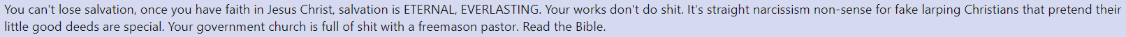 I already answered your question but you wanna act like a little cunt bitch because you hate God. Typical manipulation... the answer is yes, you can sin, any sin, have faith in Jesus Christ, and go to heaven. This is reality. The Bible also says: