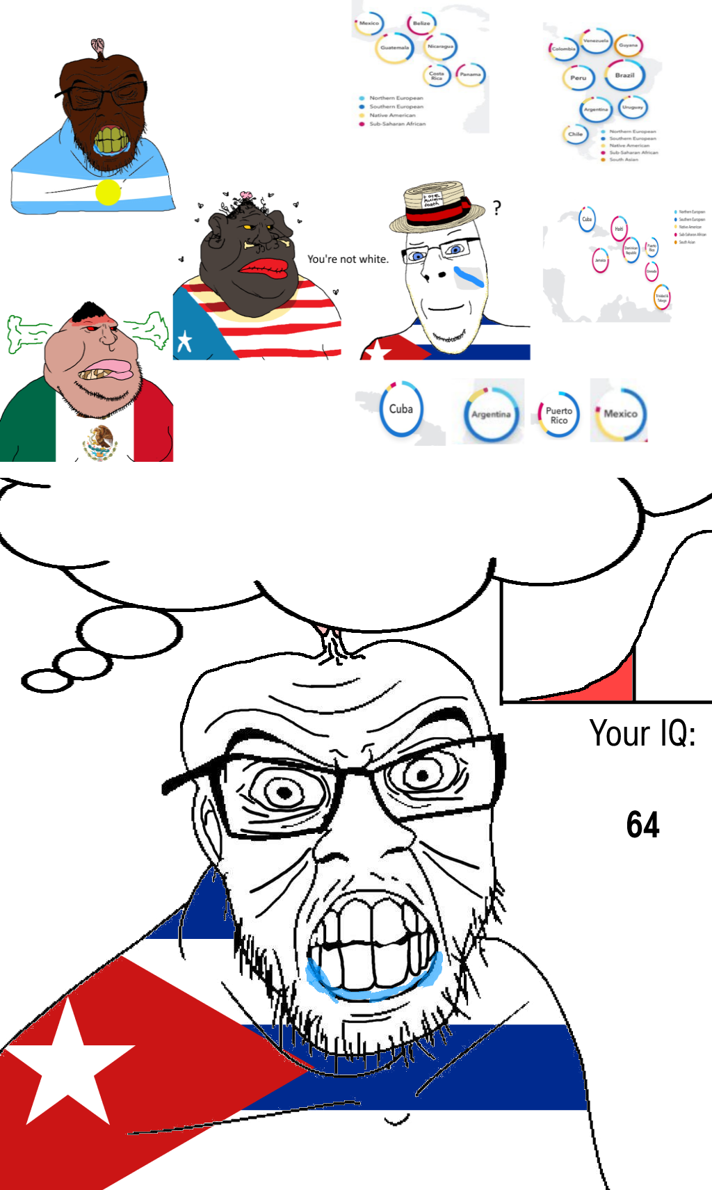 Holy copiumit's due to the niggers and mulattoes, there's more whites in Cuba but not enough to make it a huge leap because it partially gets cancelled out with the amount of pure africans in Cuba (12% of the population), so it makes PR's IQ 81, and Cuba's 85, you'd expect the more indio blood in PR to make them less retarded but apparently not