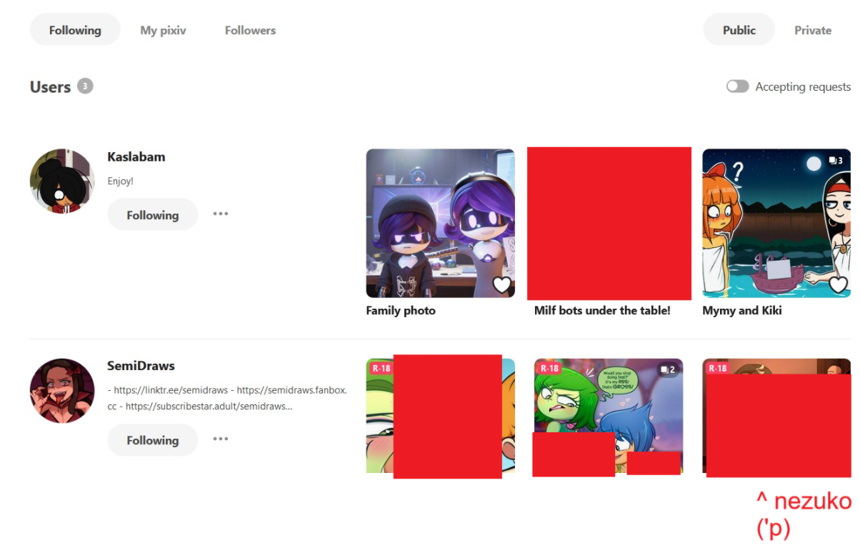 Pajeets gonna pajeet. Who groomed xim to this shit? It surprises me that a guy with seemingly loving parents could be into 'p., and he follows 'p accounts on pixiv! waaaaaaooooooow!!!!!!! another fun facterino: both of the accounts have had /raid/ threads about them (and the semidraws one was probably made by him). the 3rd account that i cropped out was just the official pixiv account, which every user follows (unless whoever's using the account unfollows the pixiv account), so i figured that didn't really matter or something like that.