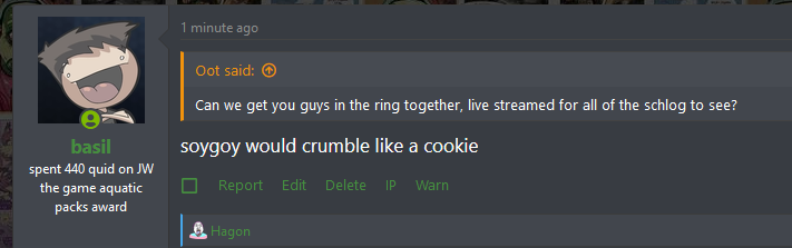 soygoy would crumble like a cookieCan we get you guys in the ring together, live streamed for all of the schlog to see?