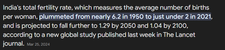 I think this projection is dumb. Hindu nationalism is experiencing a revival in India due to the threat posed by Muslims, it's highly likely that India's birth rate will start going up at some point.